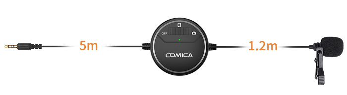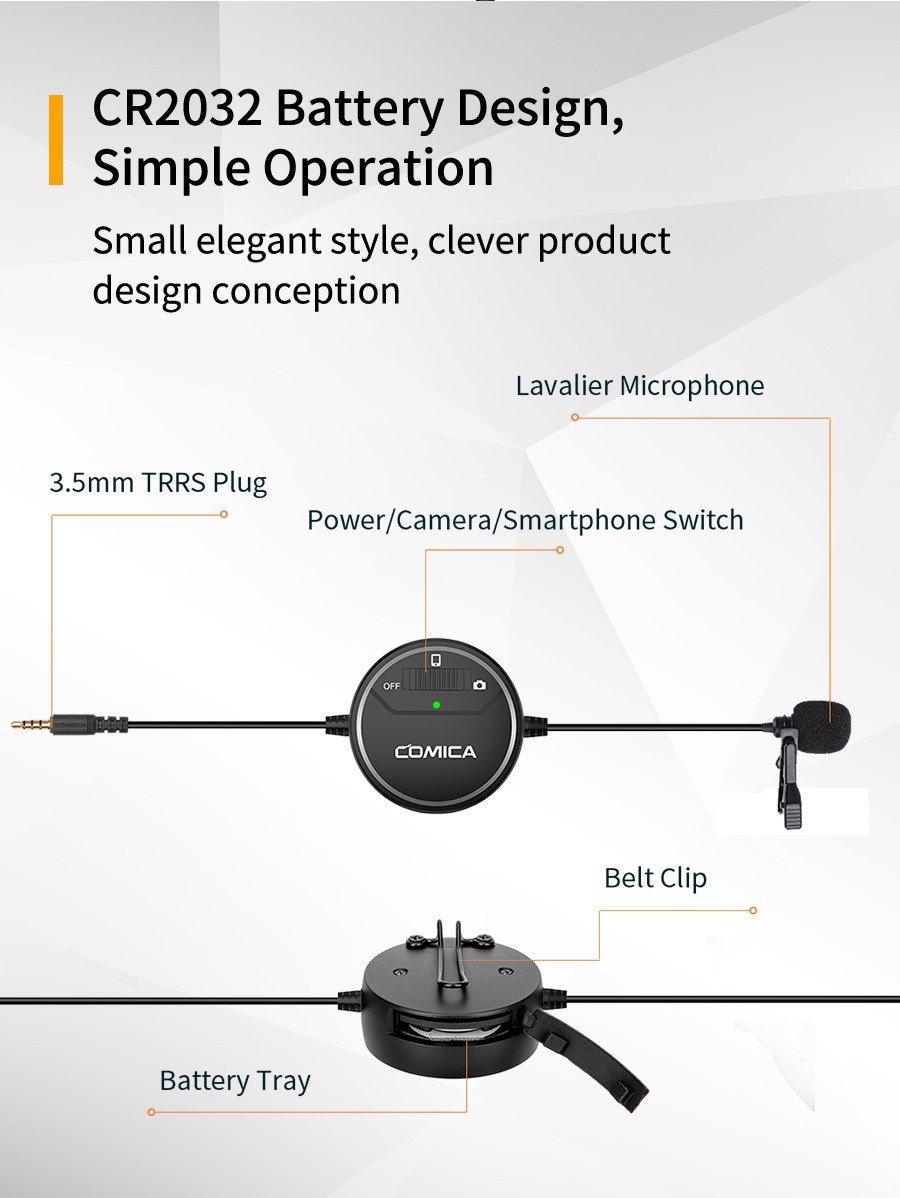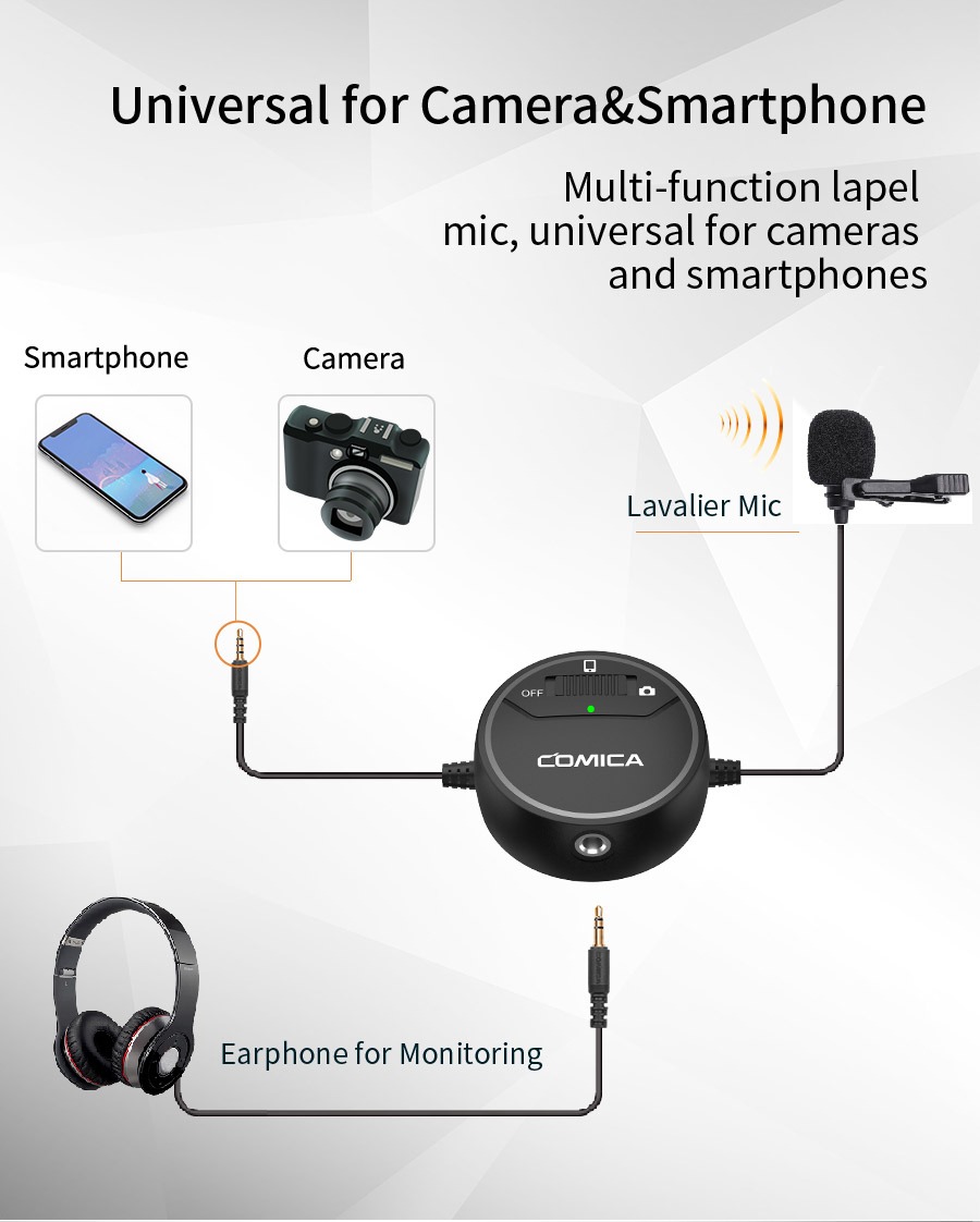 The Comica SIG.LAV V03 tie microphone can be connected to various types of recording equipment. Thanks to the mode switch, the microphone works with cameras, movie cameras and computers equipped with a mini Jack TRS jack, as well as smartphones or tablets with a TRSS jack.
