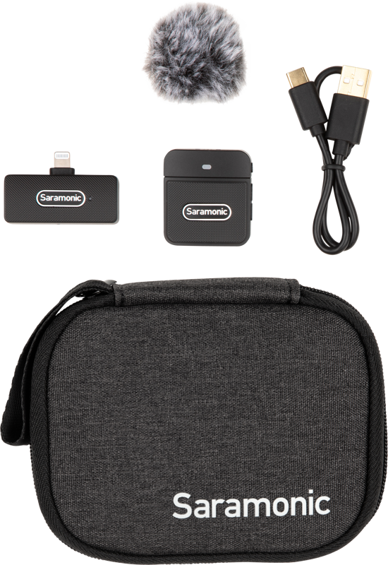 Ultracompact 2.4GHz Dual-Channel Wireless Microphone System Saramonic Blink100 wireless microphone system is an ultracompact and portable 2.4GHz wireless microphone system, compatible with smartphones, tablets, DSLR cameras, camcorders, etc. The Blink100 system features automatic pairing and selectable noise cancellation, delivering broadcast-quality sound, ideal for live streaming, vlogging, mobile journalism, and more.