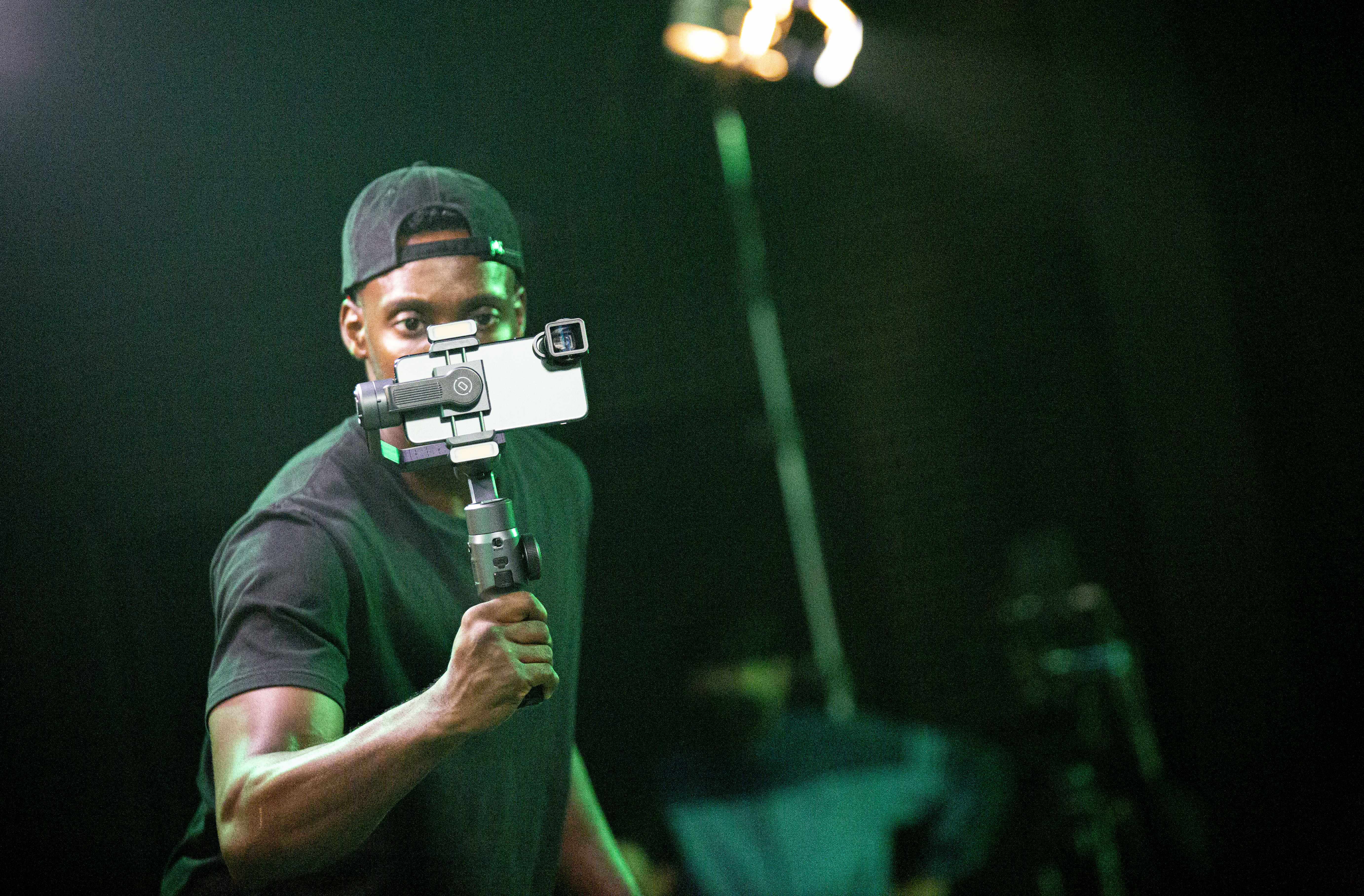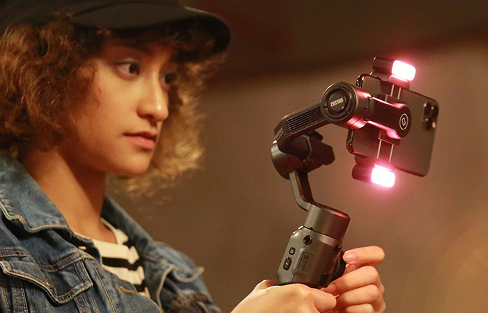 On the back of the gimbal is a new intuitively all-in-one designed control panel. With the new design it´s easy to control all the gimbals and smartphone settings and movements with just one hand even on the fly. The telephone clamp has two magnetic mounts for LED lights that are attachable on both sides and together has a brightness of 600 lumens (2x300) and a 95+ CRI. The LED´s are fully dimmable via the wheels on the control panel. Just like the recently released Crane M3, there is also the ability to put on magnetic filters that come in four colors to give and can give a cool lightning effect to your videos.