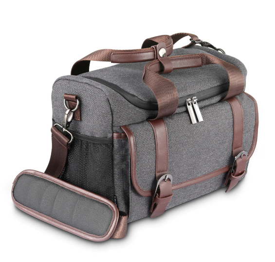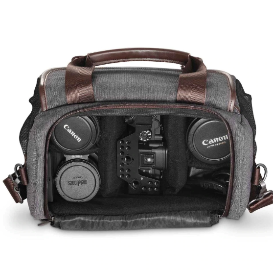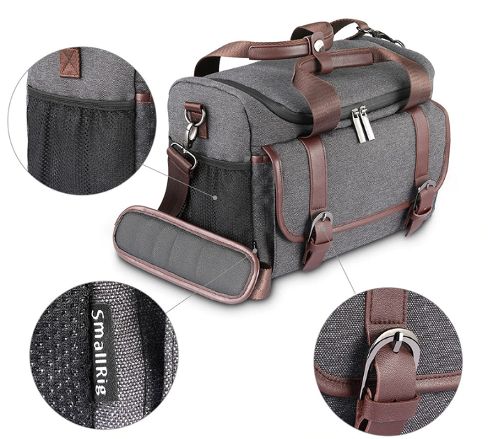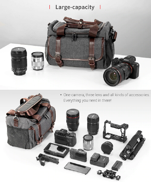 SmallRig DSLR Shoulder Bag 2208 is designed to store and carry your DSLR with 3 lenses, a monitor, a flash and more photographic accessories. It is made from durable and water-proof Nylon and features water-proof zippers, which will meet the demand of photographers who shoot outdoors. The leather details of the bag also add durability. The main compartment has four padded, adjustable dividers for organizing and protecting your gears. The rear zippered and side pockets is perfect to hold small items like your wallet, phone, battery, SD card and more.