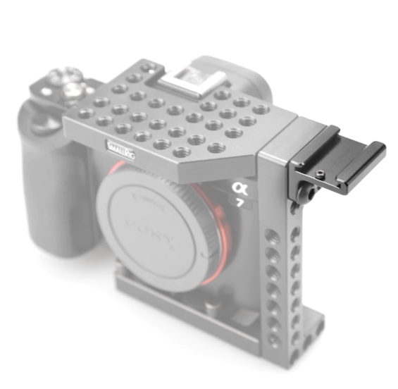This cold shoe mount can be mounted with two screws on the upper part on the side of the cage. There are often not space enough for a microphone, on the top of the cage, because of the handle. So you can solve the problem with this cold shoe mount.