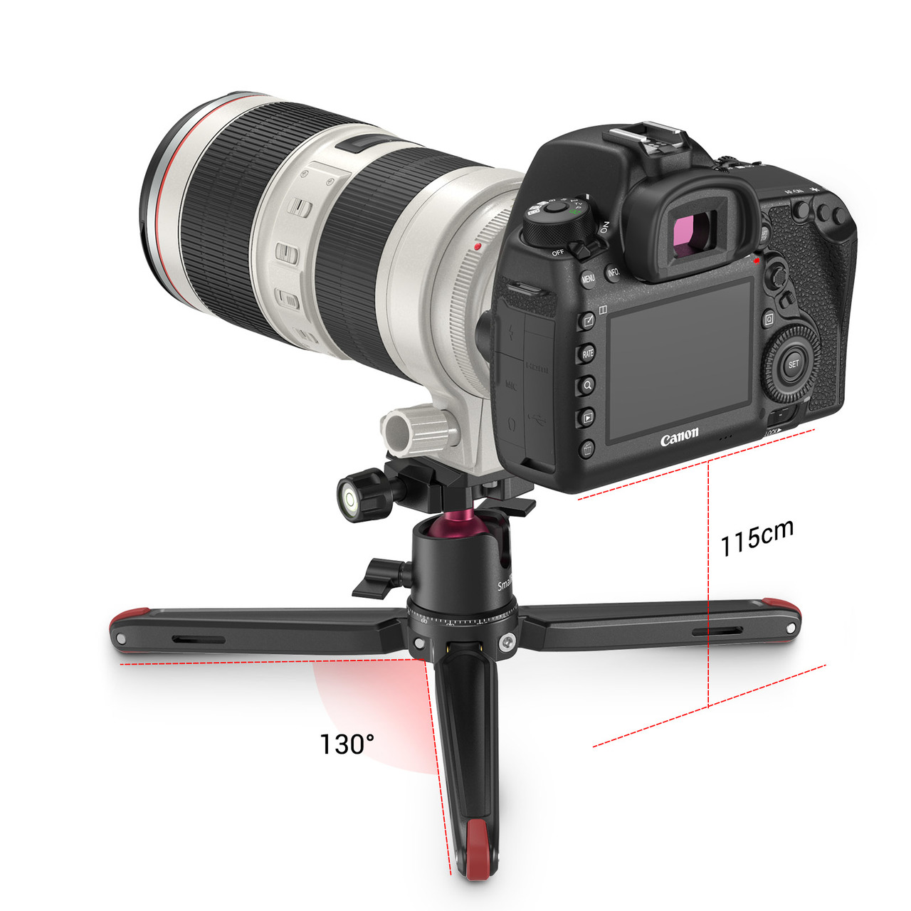 SmallRig Tabletop Mini Tripod with Panoramic Ball Head BUT2664 is the perfect mini tripod for compact DSLRs, mirrorless cameras, smartphones, action cameras, and other devices, and can also act as a grip for handheld shooting. The tripod without ball head holds up to 20kg while the ball head itself holds up to 2kg. It’s solid and secure, and the rubber feet guarantee a stable and slip-free foundation on any surface. The ball head with accurate calibration support 360° panoramic rotation for panoramic shooting, -90°/+45° front tilt and -50°/+50° lateral tilt for multi-angle adjustment including horizontal shooting and vertical shooting. It comes with a standard Arca-Swiss plate, which is compatible with other Arca-Swiss clamps to ensure a quick mount/dismount of your device.