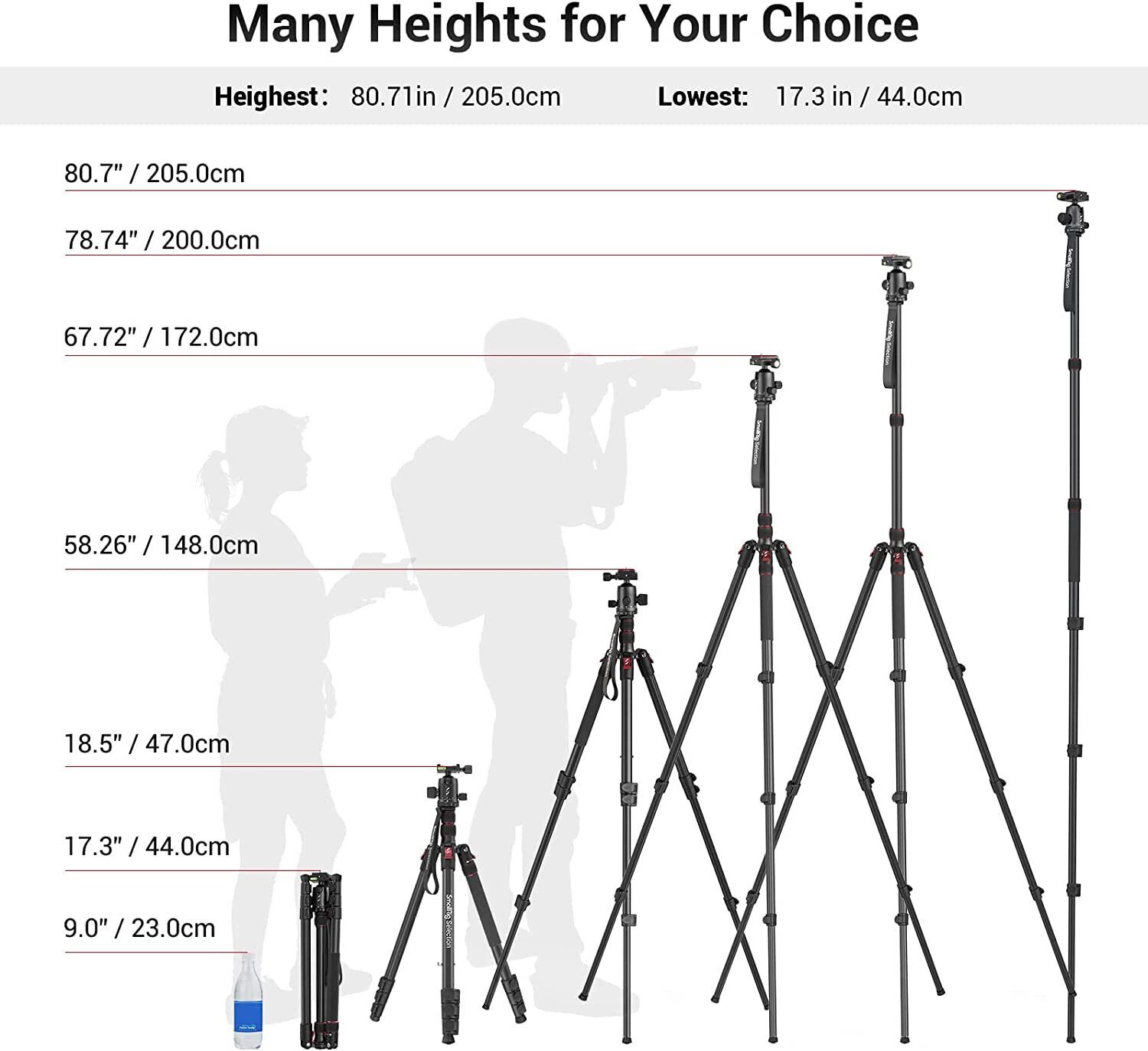 The aluminum tripod can be easily turned into a monopod or walking stick, it is a good companion for you to go hiking or traveling. And the central pole can be inverted to allow for low-angle shooting and macro photography.4-section column legs with 3 quick-release flip-locks allow you to adjust the working height from 18.5" to 78.7" in seconds. 19.6" folden size is easily taken to anywhere for outdoor photography.