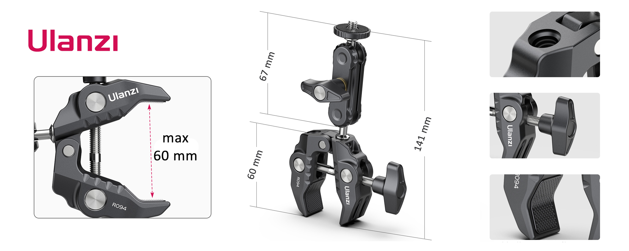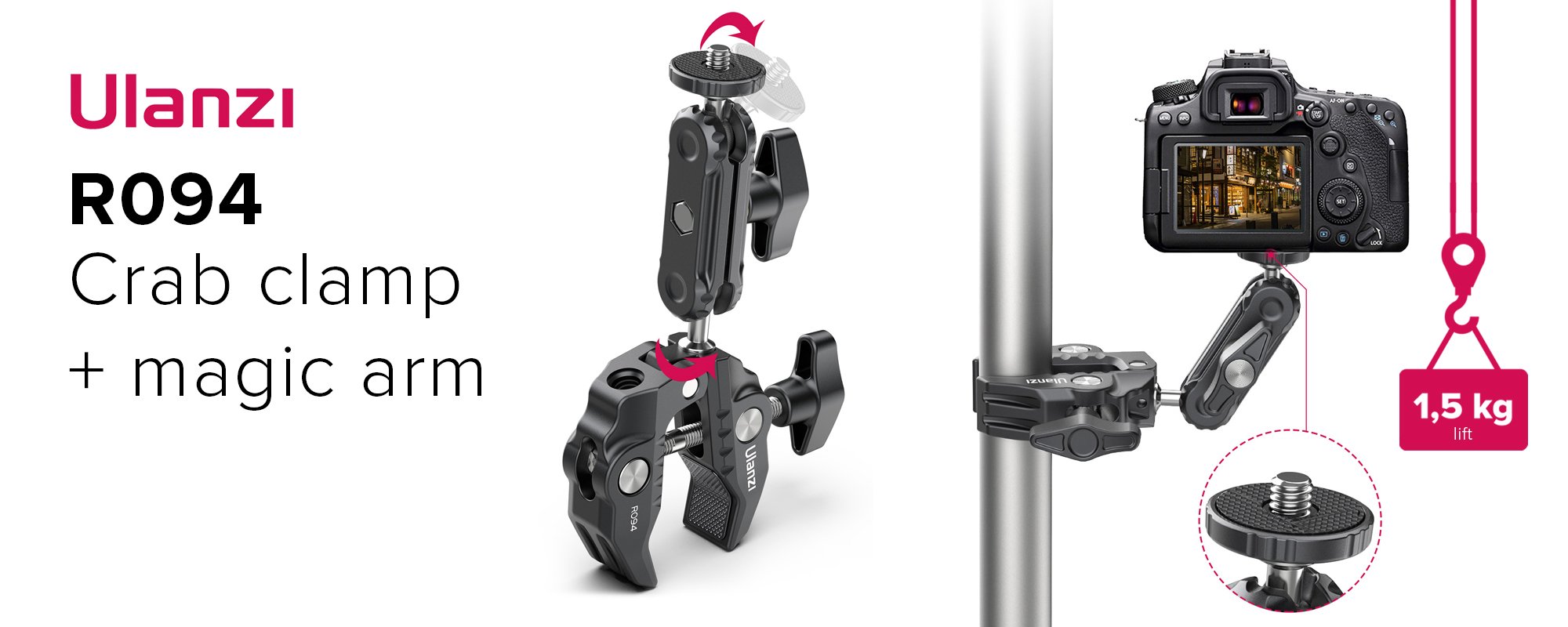Ulanzi R094 is a universal magic arm mount ideal for connecting cameras, microphones, monitors or sports cameras to unusual mounting points. The clamp has a maximum jaw span of 6 cm. Standard 1/4″ thread ensures compatibility with hundreds of different devices. Sturdy construction made of durable aluminum alloy allows stable mounting of equipment weighing up to 1.5 kg. The 2 joints and the use of ball heads allow precise angle adjustment. With compact dimensions, a weight of 180 grams and an ergonomic design, the Ulanzi R094 mounting bracket is the ideal choice for creative filmmakers who want to expand their handheld photo-video accessory kit.
