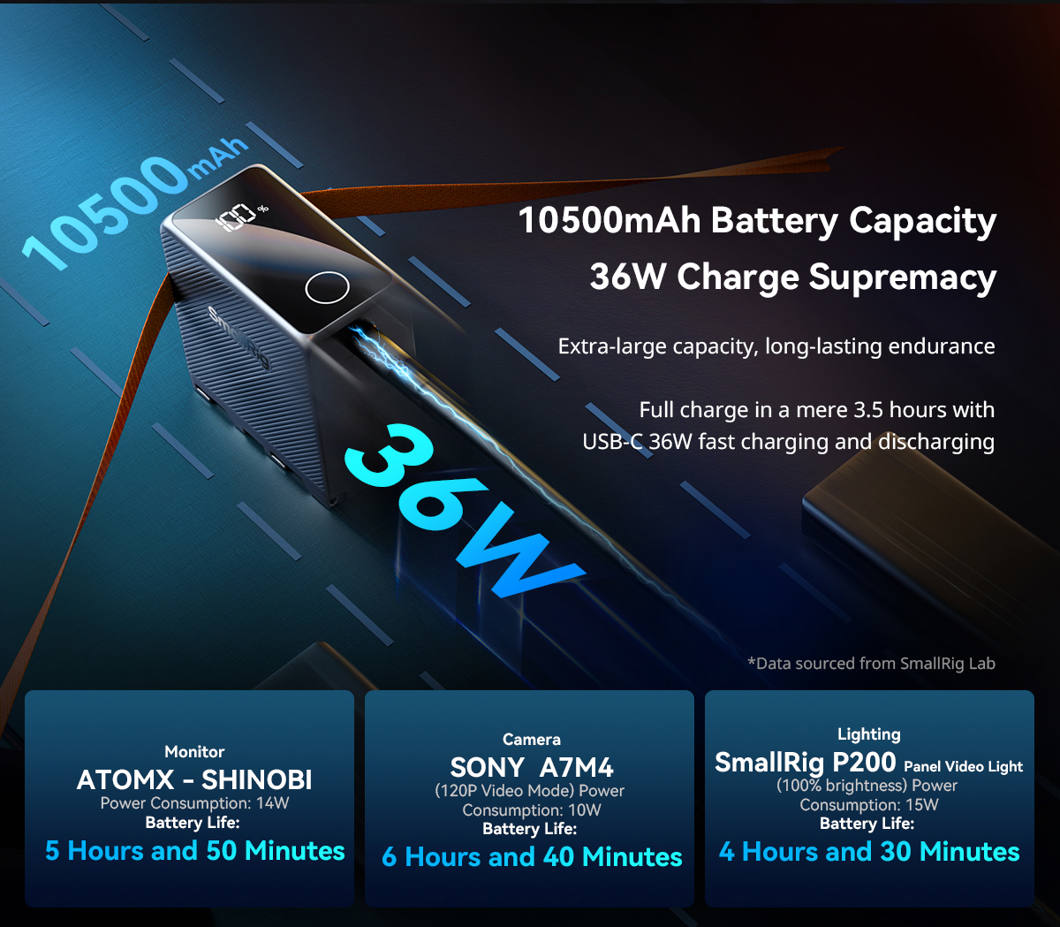 Akumulatora apakšdaļā esošā galvenā pieslēgvieta var darbināt dažādas ierīces, piemēram, kameras, LED video gaismas, monitorus, motorizētus slīdņus un citas.