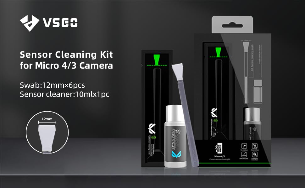 the VSGO Sensor Cleaning Rod Swab Kit is the ideal kit for your mirrorless 12mm sensor camera. Made with a microfiber tip, this swab is specifically made to be as gentle as possible with your sensor. The included non-corrosive sensor cleaning agent solution will remove grime and oils leaving no damage to your sensors protective coating.