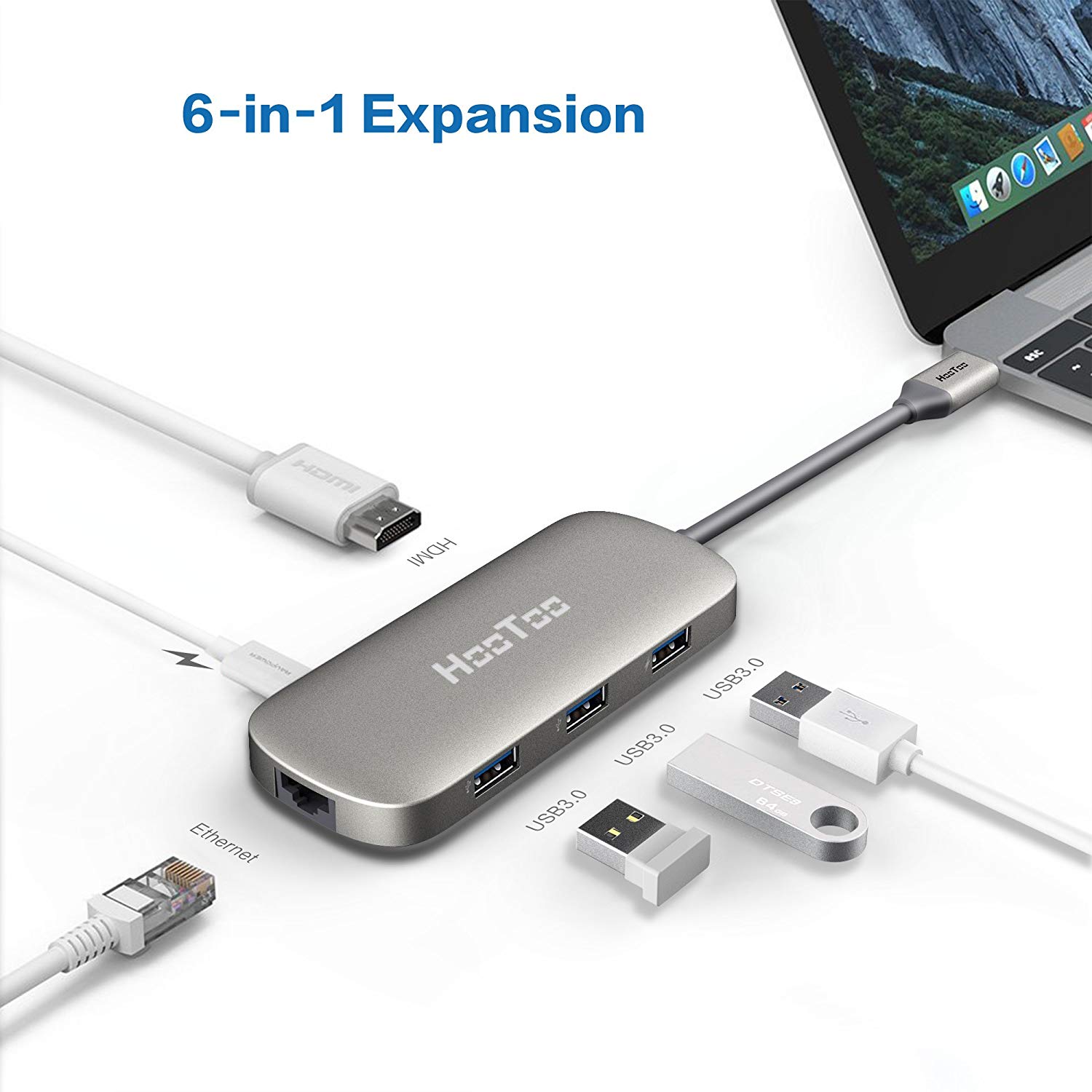 All-in-one Type-C hub: connects to the latest MacBook Pro or Type-C devices and adds 1 x Ethernet port, 1 x Type-C charging output, 1 x HDMI port, and 3 x USB 3. 0 Ports