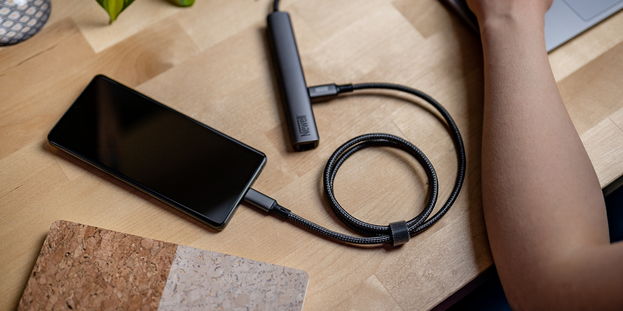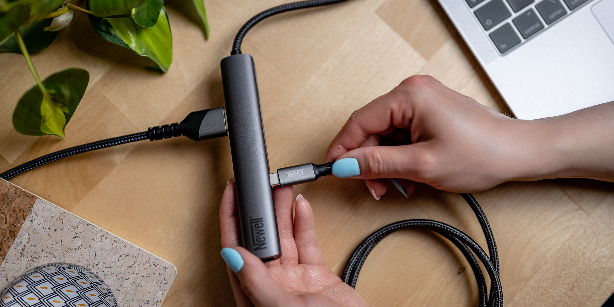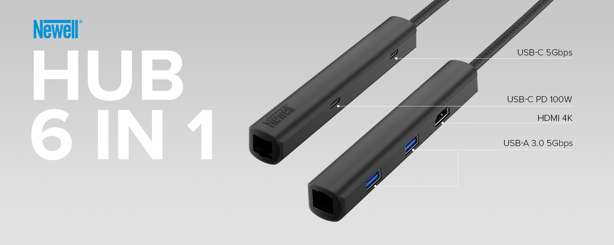 The minimalism of modern computers and tablets does not always go hand in hand with functionality. If you work with several external drives or connect additional accessories to your laptop, the number of available ports may not be enough. That’s when the Newell 6-in-1 hub comes to the rescue. This small and handy device will provide you with access to 2 USB 3.0 ports, 2 USB-C ports (including one supporting 100W Power Delivery technology), an HDMI port (4K 60 Hz) and an RJ45 jack.