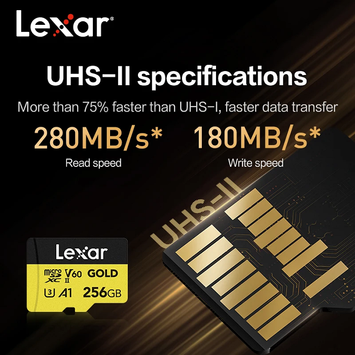 High-Speed Performance | Fast Video Capture | With V60 Class | Feature A2 Class The Lexar Professional GOLD microSDXC UHS-II Card is the perfect high-performance card for capturing drone and action camera footage and is also great for UHS-II portable gaming devices. Read speeds up to 280MB/s1allow you to quickly transfer massive amounts of files and load games fast while write speeds up to 180MB/s1 and a V60 rating let you capture high-quality images and extended lengths of Full-HD and 4K UHD video.