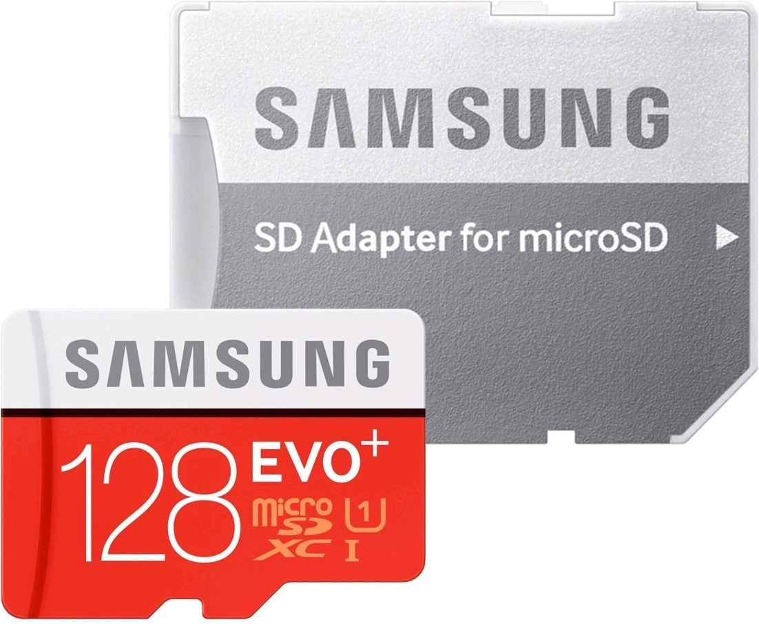 This EVO+ UHS-I microSDXC U3 Memory Card (Class 10) with Adapter from Samsung holds 128GB of data. Its Ultra High Speed Class 1 (UHS-I) bus interface enables it to achieve maximum read and write speeds of 100 MB/s and 30 MB/s respectively, which are far greater than the 10 MB/s minimum speeds guaranteed by the Class 10 and UHS 1 ratings. This microSD card is ideal for Full-HD video recordings and high resolution pictures. An SD adapter is included, allowing you to use the card in a full-size SDHC/SDXC slot.