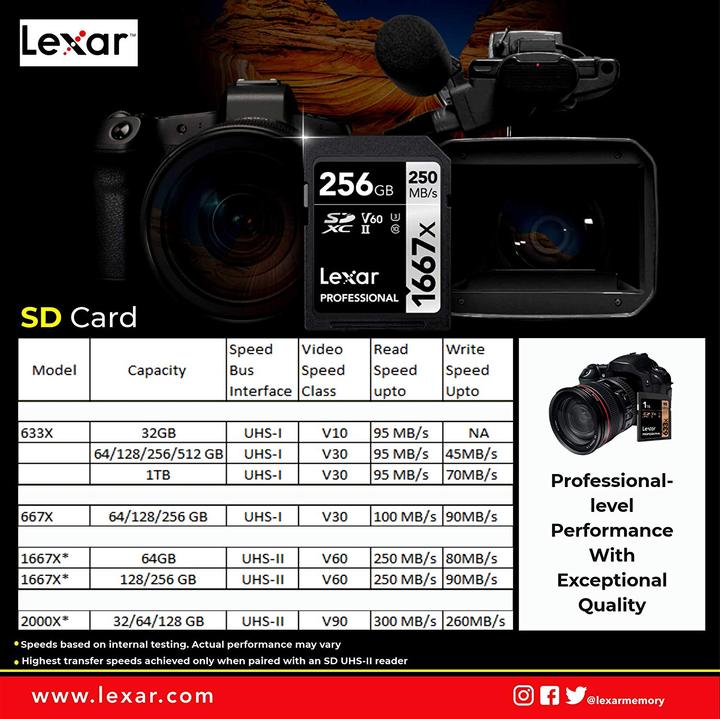 Whether you’re a professional photographer, videographer, or enthusiast, Lexar Professional 1667x SDXC UHS-II cards make it easy to quickly capture and transfer 1080p full-HD, 3D, and 4K video.