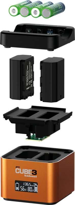 ProCube3 var uzlādēt gan kameras oriģinālās baterijas, gan citu ražotāju baterijas.