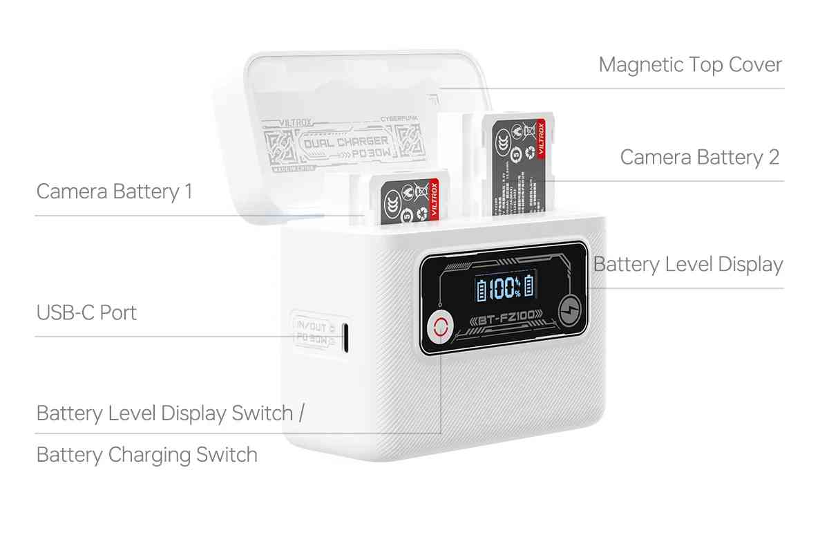Charge your devices quickly with Viltrox Camera Battery Charging Case Power Bank for Sony NP-FZ100, fully charging the case in just 80 minutes for ultimate convenience.