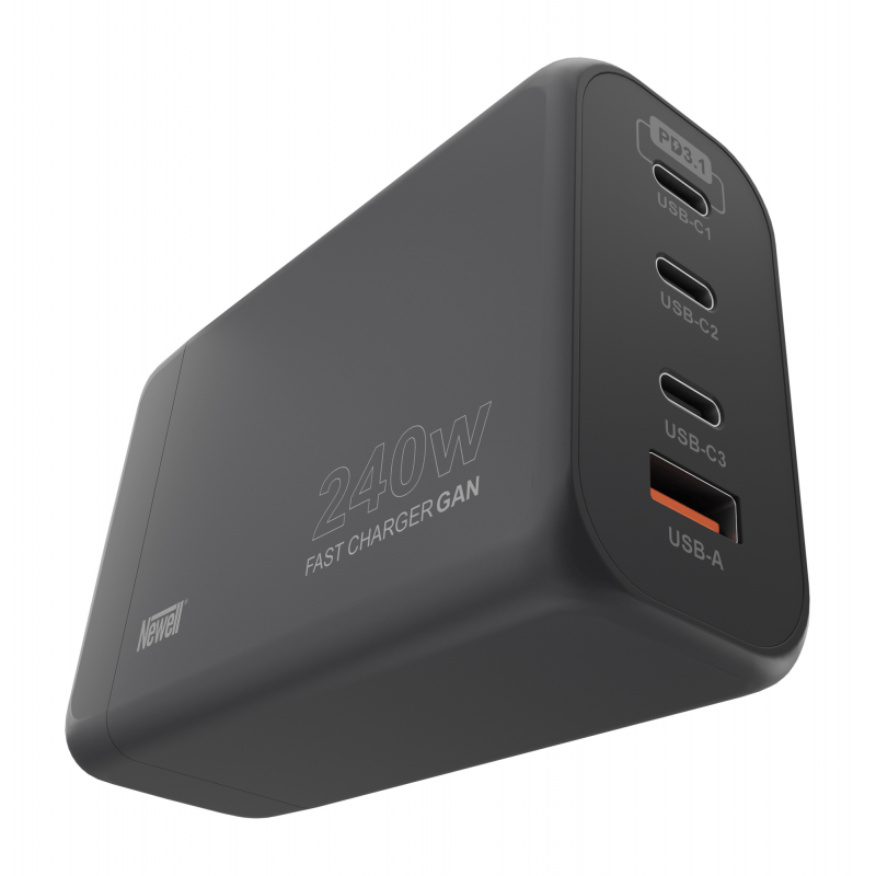 The Newell GaN 240 Watt AC Charger – EU is a space-saver and a great choice for those who travel frequently. The device provides access to four charging ports – 3 USB-C and with USB-A. The GaN charger will allow you to quickly and conveniently charge your smartphone, tablet, laptop, smartwatch, e-book reader flashlight or other USB-compatible device.