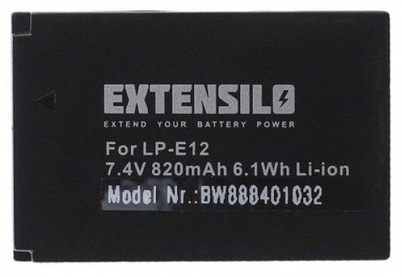 - Akumulators: EXTENSILO BATTERY 820 mah Canon LP-E12 / Eos-M , Eos-M2 , Eos-M100 , Eos-M50 , Eos-M10 , 100D