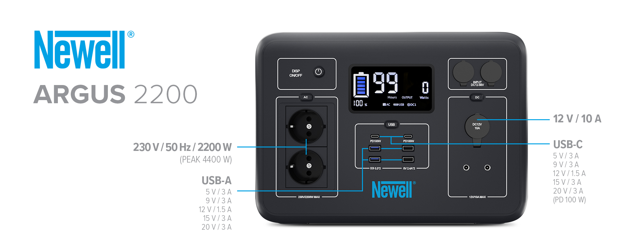 The Argus 2200 is a very powerful representative of Newell’s family of modern power stations. It features 2 AC sockets, 2 USB-C ports (100 W Power Delivery), 4 USB Type A ports, 2 DC power sockets and a DC 12.8 V – max. 10 A (adjustable) cigarette lighter socket. The total capacity of the station is up to 2131 Wh. The device will allow you to quickly and conveniently charge hundreds of different devices, wherever you do not have access to traditional power sources. It’s the ideal choice if you’re travelling in a camper van or camping overnight. The Argus 2200 will also be an ideal choice for the allotment, workshop or tent. The station can be charged from a traditional AC socket, car lighter or solar panels. Up to 2 AC adapters and a set of DC cables are included.