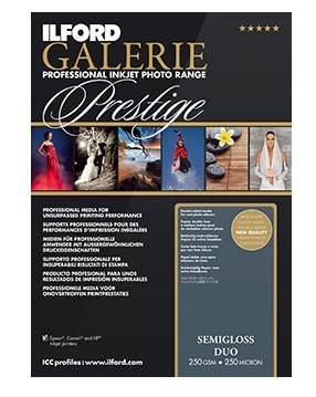 GALERIE Prestige Semigloss Duo is a true double-sided resin coated media with a professional semigloss finish. The paper has a natural photographic white tint to produce prints with superb colour gamut, perfect for skin tones.