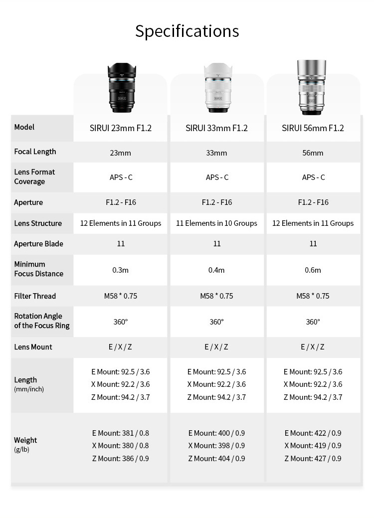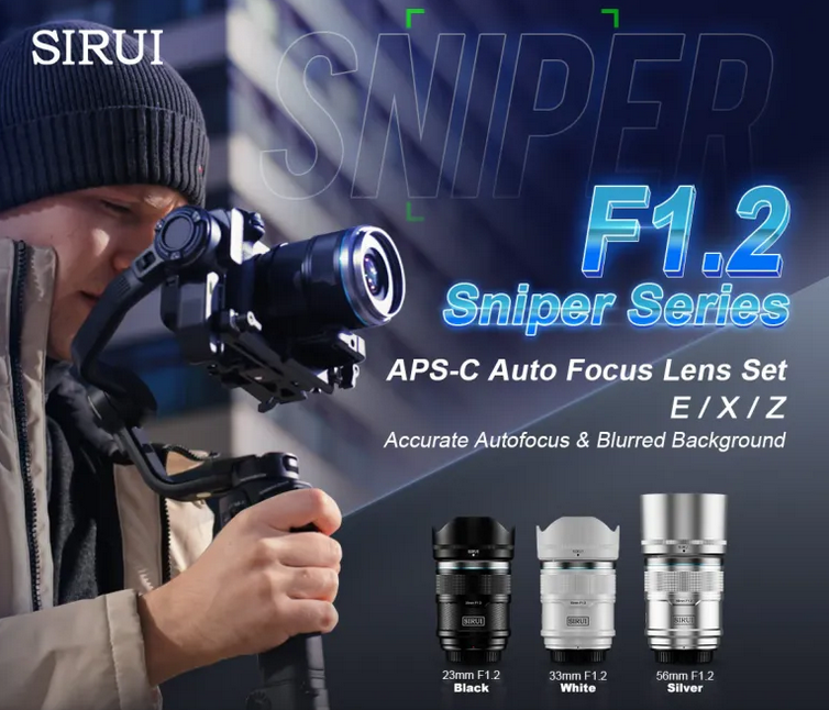 objektīvs»SIRUI»Sirui Sniper Lens APS-C AF Kit 23, 33 & 56mm F1.2 E-Mount Black Carbon»(new)