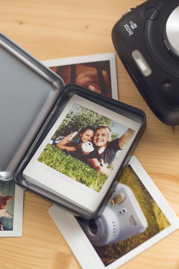 Compact aluminum box for storing instax square photos. It's small, perfect for a handbag, take it with you to show photos to your friends and family.
