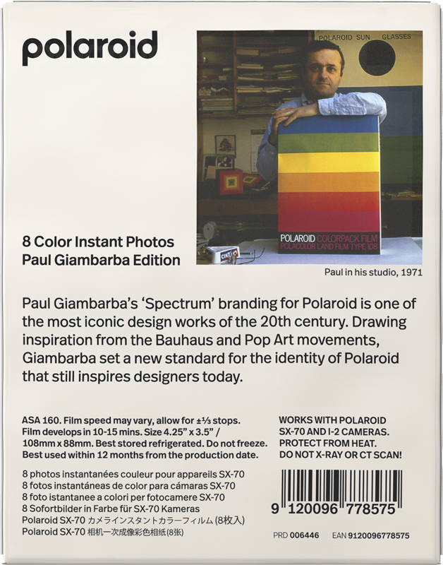 Patiess Polaroid vēstures gabals. Šī ir iespēja izmantot 1970. gadu SX-70 oriģinālā iepakojuma būtību - īstu Polaroid vēstures liecību. Uzņemiet ar 8 klasiskajiem baltajiem rāmīšiem un noteikti saglabājiet kastīti kā vērtīgu mākslas darbu.