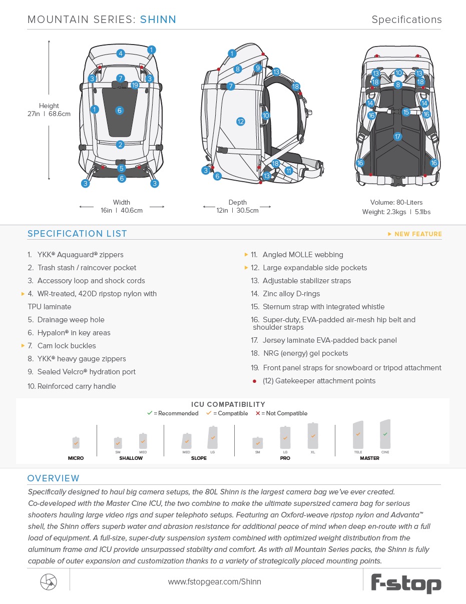Shinn The backpack is compatible with all ICUs of F-Stop though the company recommends for the Master Cine ICU firsthand. The backpack has four attachment points for ICUs to always firmly and securely so attached to the Shinn. Because the bag is intended for professional use, the various boxes and the mounting of a tripod adjusted accordingly. It is possible to attach a professional video tripod bag and the pockets on the side and top extra large so there is plenty of room for cables and other accessories.