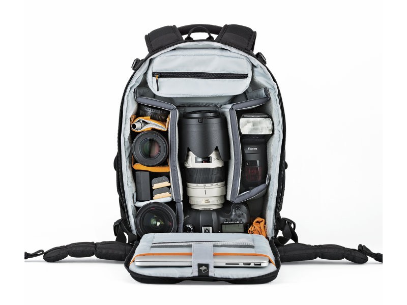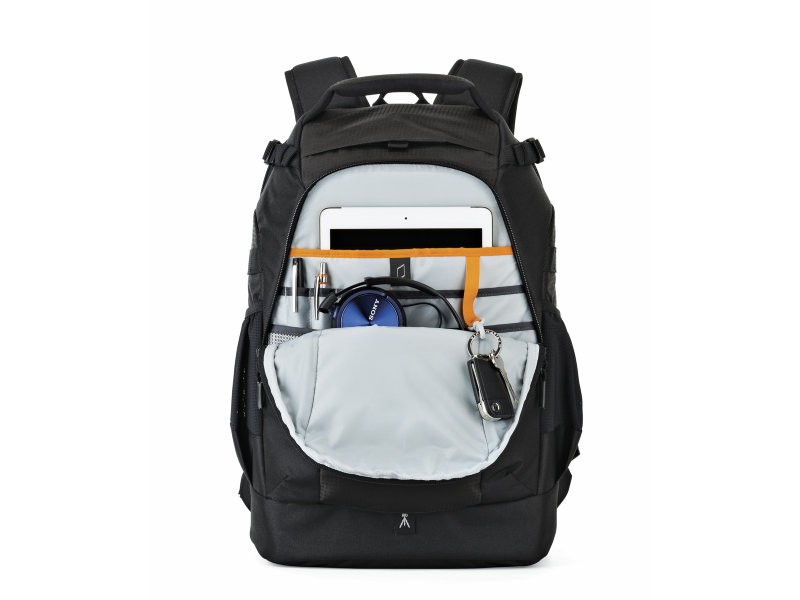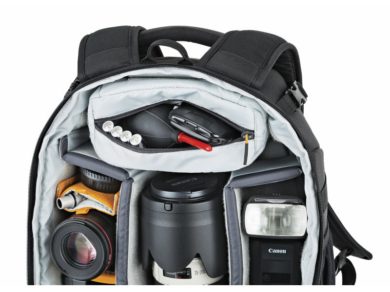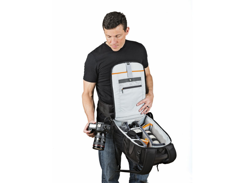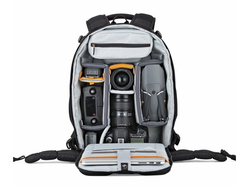 Flipside body-side access allows you to get your gear without putting the bag down. Carries DSLR camera kit or easily configured for a drone, such as the DJI Mavic. Padded interior top pocket for cords and chargers. A built-in All Weather AW Cover™ may be deployed from a pocket at the bottom of the pack for extra protection from rain, snow, dust and sand.