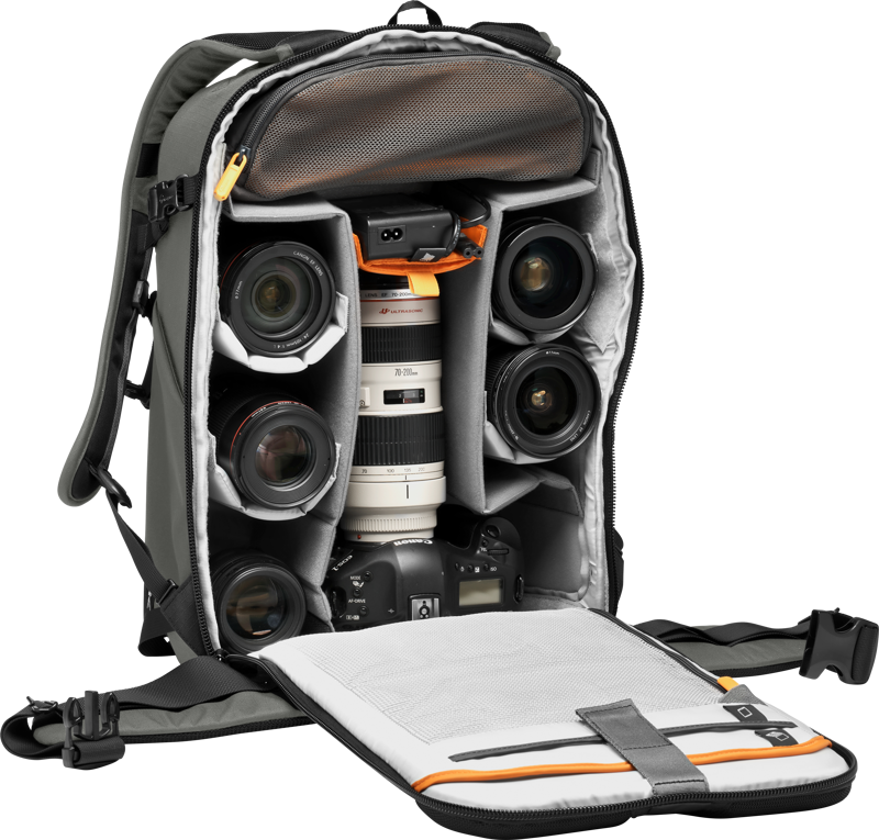 Enhanced 10mm YKK® zippers give a smoother path while front molded EVA bumpers deliver increased security for valuable equipment when the bag is set down. All Weather AW Cover™ protects gear from rain, snow, dust and sand. Load in your DSLR or mirrorless camera with portrait grip with lenses or compact drone, plus compact tripod, 15'' laptop and 10” tablet. Front storage panel & removable, padded accessory pouch included.