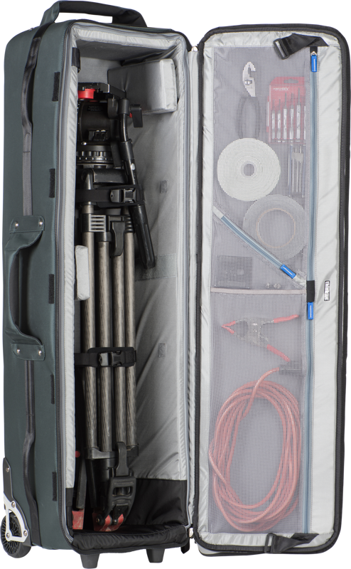 The Video Tripod Manager 44 is a well-cushioned, highly rigid rolling case that provides hard case protection with soft case convenience.