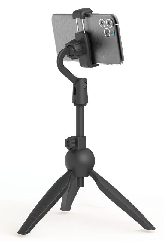 Compact phone stand that also can be used as a monopod selfiestick. Easy adjustment to portrait or landscape mode. Can be used with all smartphones.