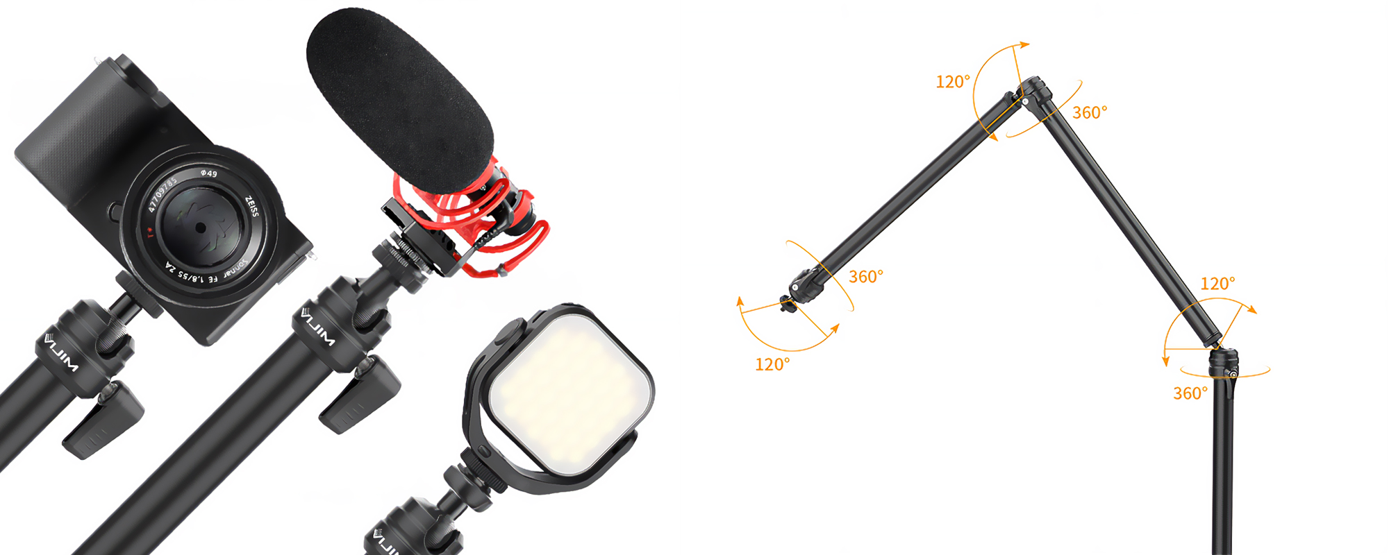 conveniently mounts a camera, camcorder, microphone, preview screen, projector, sound recorder, LED light or other audio/photo/video accessories