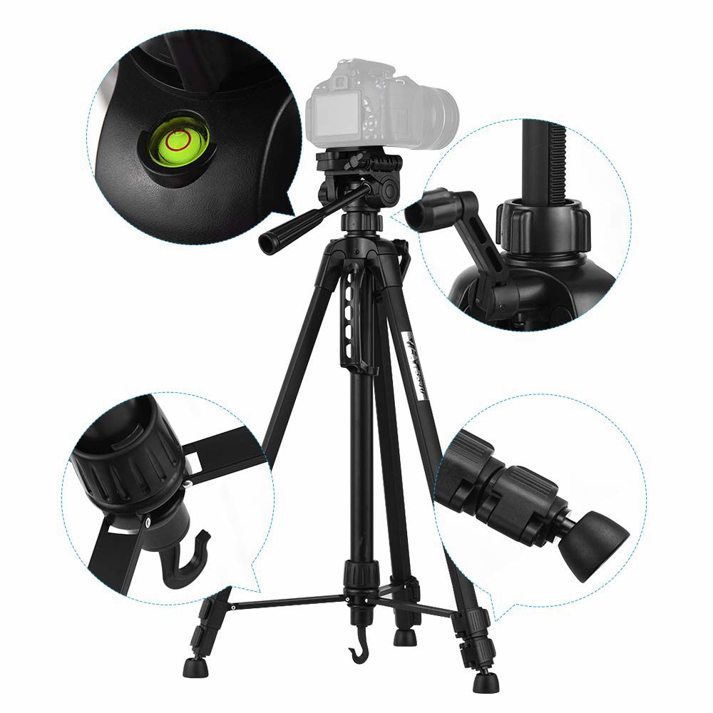 The WT-3540 by Nest is a high quality tripod, which belongs in every standard camera equipment. Thanks to its light weight and compact size, the tripod is easy to transport in the included tripod bag. The aluminum legs provide a stable and reliable whole. Nevertheless, the complete tripod weighs only 1.23 kg. The maximum height is 1.57 meters and the minimum height is 60 centimeters. This guarantees stable and reliable use in almost any location. The legs have a diameter of up to 25x19.2 mm.
