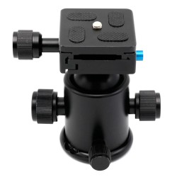 The Caruba KS-0 is a professional ball head that gives you maximum control over your camera adjustments. The head has a maximum load capacity of 8 kilograms and features three independent locking buttons for general positioning, panning and friction. The ball head is made of precision finished and stylish black anodised aluminium. The Arca-Swiss compatible quick release system allows for quick insertion and removal of the camera. A security catch in the quick-release mechanism also prevents your camera from accidentally sliding off the ball head.