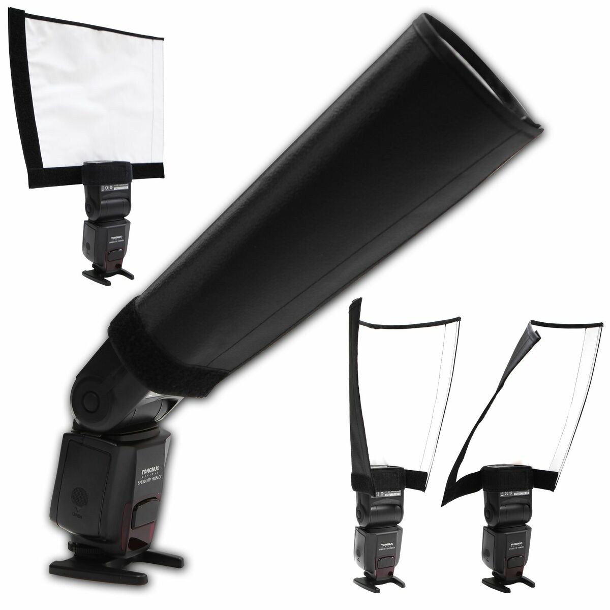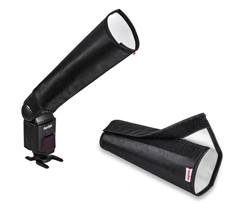 The Godox Snoot Flash Diffuser Beam converges the light to a specific area to highlight an object and create more light and shadow effects. The diffuser is attached with Velcro to the flash.