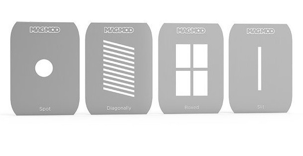 The masks with geometric shapes can easily be placed in the integrated gel slot of the MagBeam. That way, you can get special results wherever you want. In fact, the masks are gobos, or a go between object, that you place between the light and the background or your subject for a special effect.