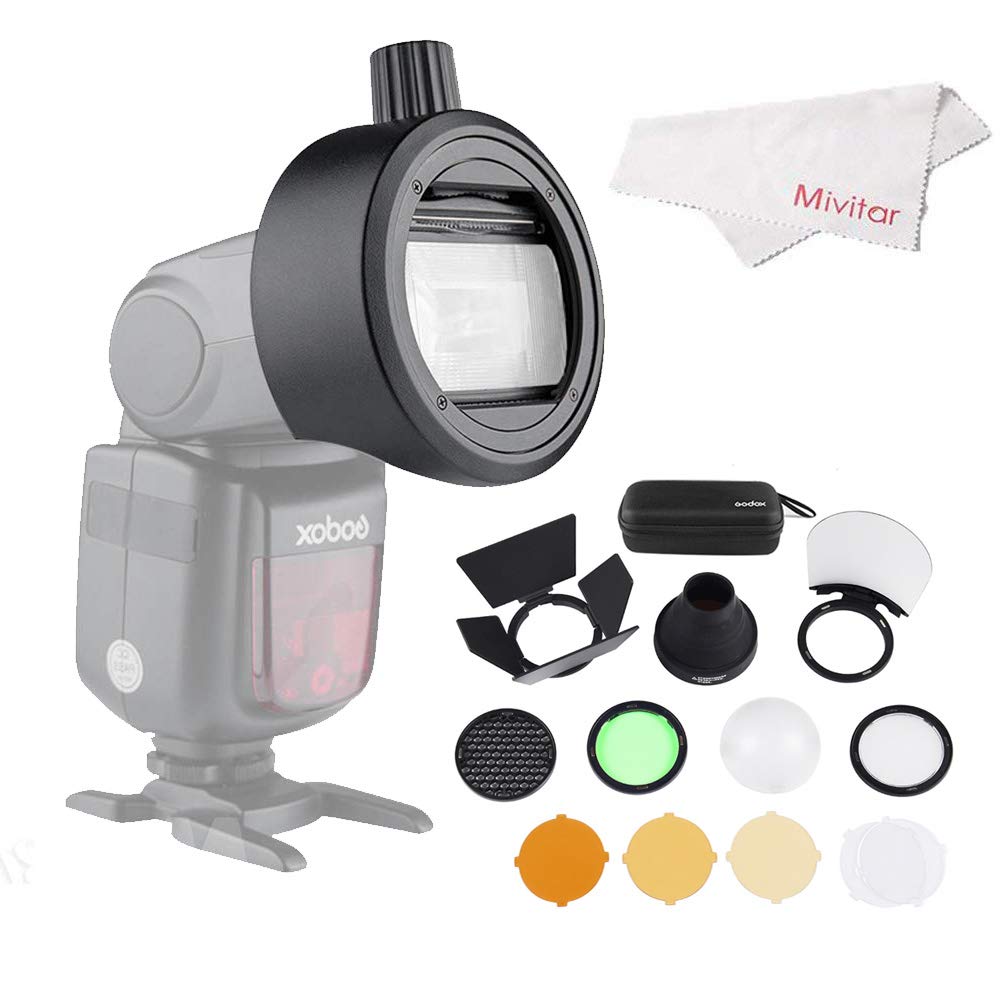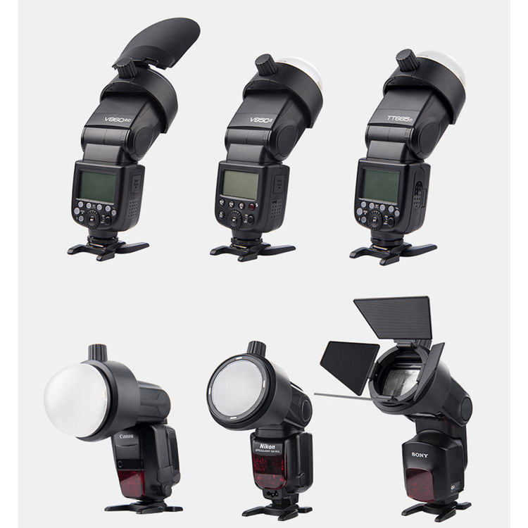 Attaching very quickly via a thumbscrew, the Round Head Magnetic Modifier Adapter from Godox is the base component of a magnetic system that attaches simply and quickly to square-shaped speedlights from Godox, Nikon, Canon, and Sony. The modifier holds your speedlight securely by employing texturized rubber mats on its top and bottom. Separately available accessories such as barndoors, a dome, a honeycomb grid, a snoot, bounce card, and filters attach quickly to the front of the adapter via magnets.