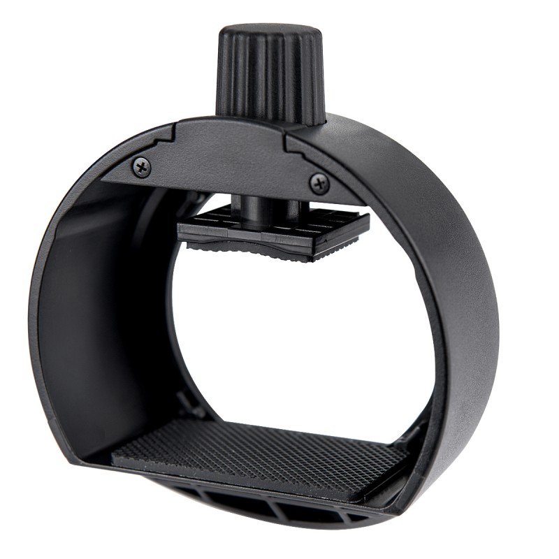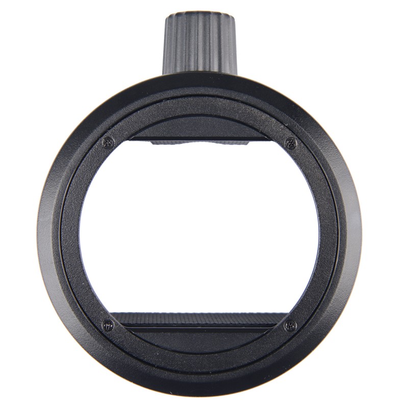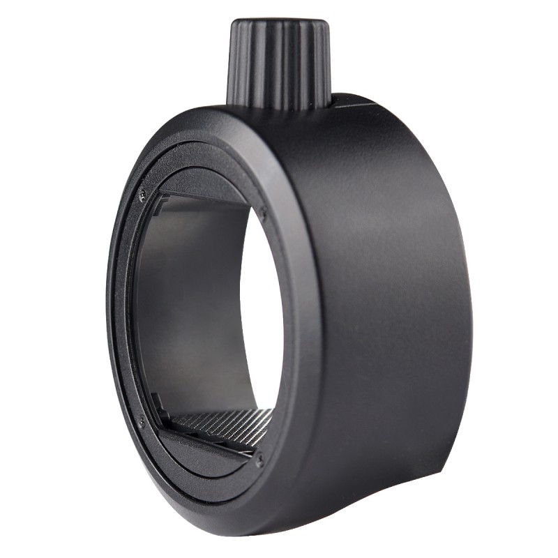 The S-R1 adapter slides onto rectangular flash heads to provide a round magnetic mounting point. Gridded rubber mats on the inside surface of the adapter provide scratch-free grip, and a knurled knob on top helps tighten the adapter around flashes of different sizes.