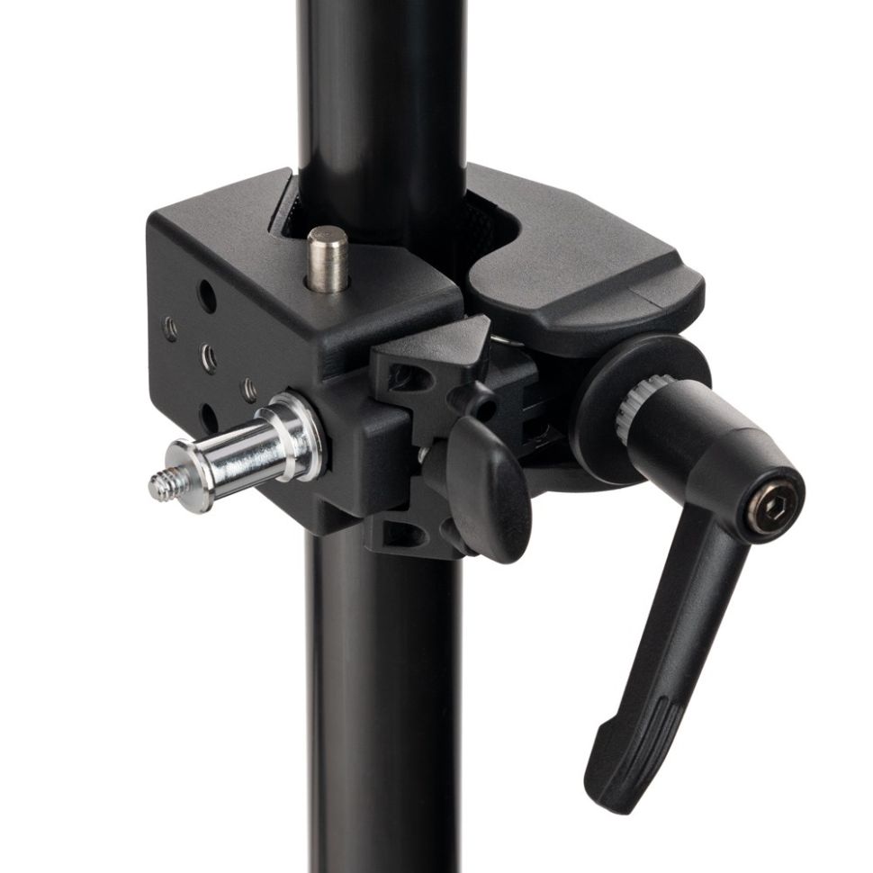 The Godox LSA-03 Nano Clamp is suitable for attaching light accessories such as gobos, reflectors or cloths to your lamp stand. The clamp has a 5/8" connection. Tighten the clamp firmly with the large handle.