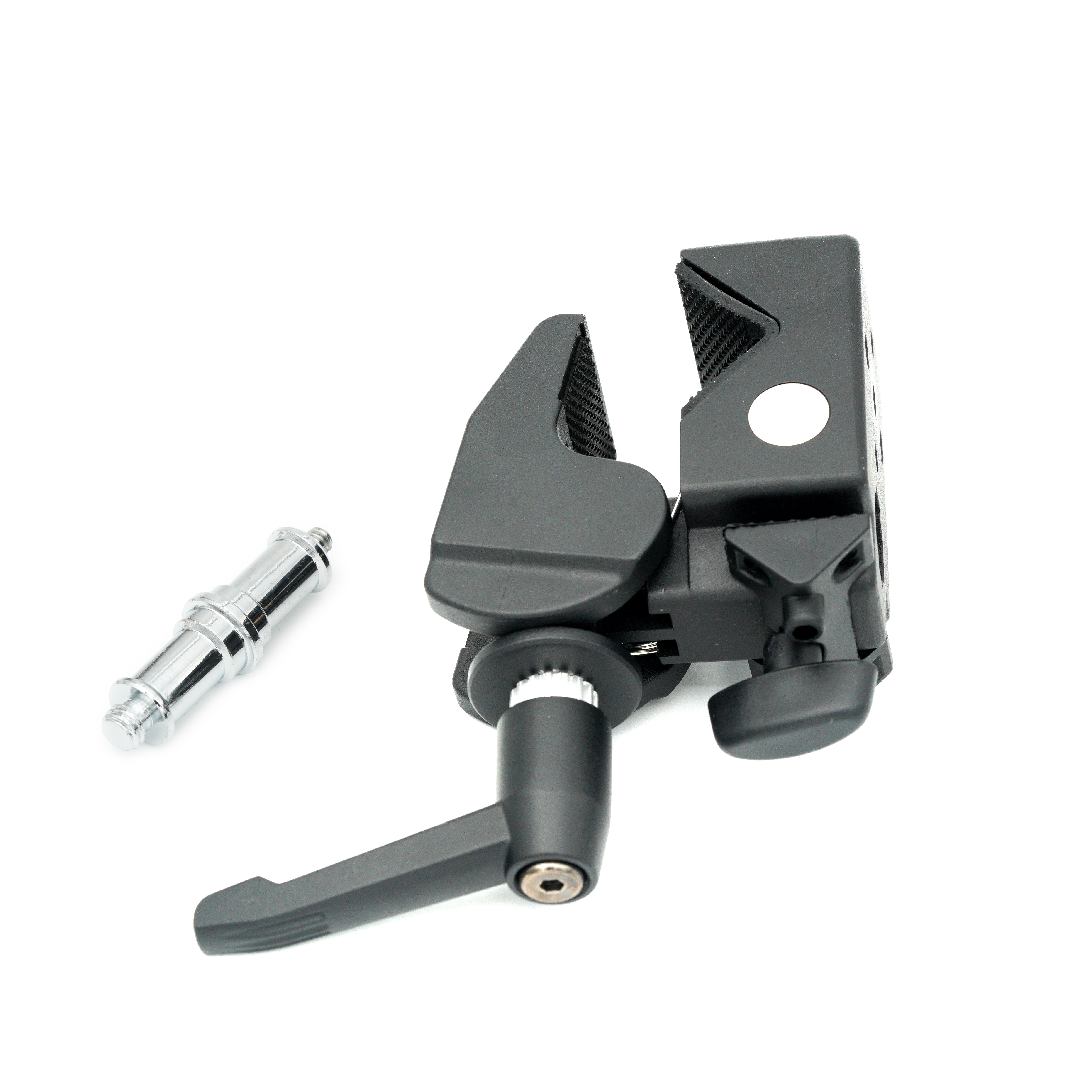 The Godox LSA-03 Nano Clamp is a highly durable piece of studio grip clamp equipment, with an ultra-high maximum load capacity of 15kg. It is made from a durable powder-coated aluminium alloy, and it features a hexagonal spigot receiver, enabling it to take various accessories with a hex-stud mount. This enables it to take high loads, without fear of accessory rotating. It can also be used with standard 5/8-inch studs or spigots making these clamps highly versatile. The NanoClamp robust jaw can be clamped to any surface between 8 - 55mm and can firmly grip onto poles such as light stands or truss systems, or flat surfaces such as table-tops and doors.