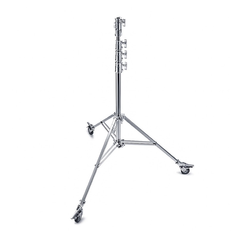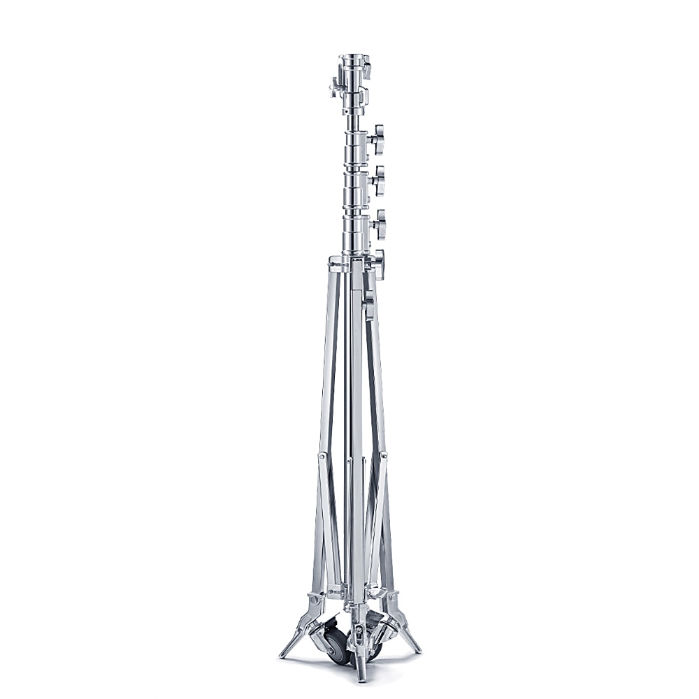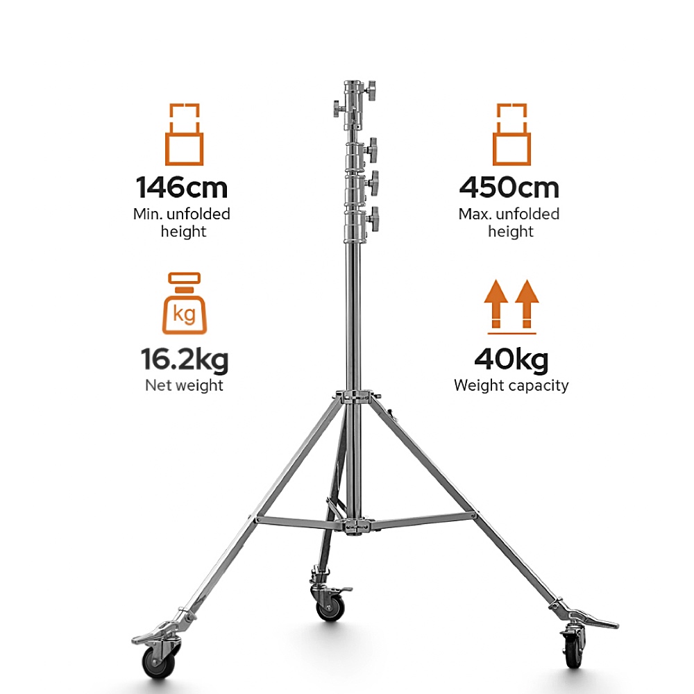 The Godox Roller Stand for Video Light SA5045 is a heavy-duty stand that can support up to 40 kg and featuresa folding base and wheels. It gives you superb stability thanks to it’s strudy constrocytion and solide design. The unfolded height of the stand ranges from 146cm to 450cm. With one adjustable leg, the stand can extend to level it in uneven terrain, on stairs, or in tight spaces. A 1-1/8” Junior receiver and retractable 5/8”pin which can be swung 90 degrees to allow gear to be mounted vertically or horizontally are featured in the stand.