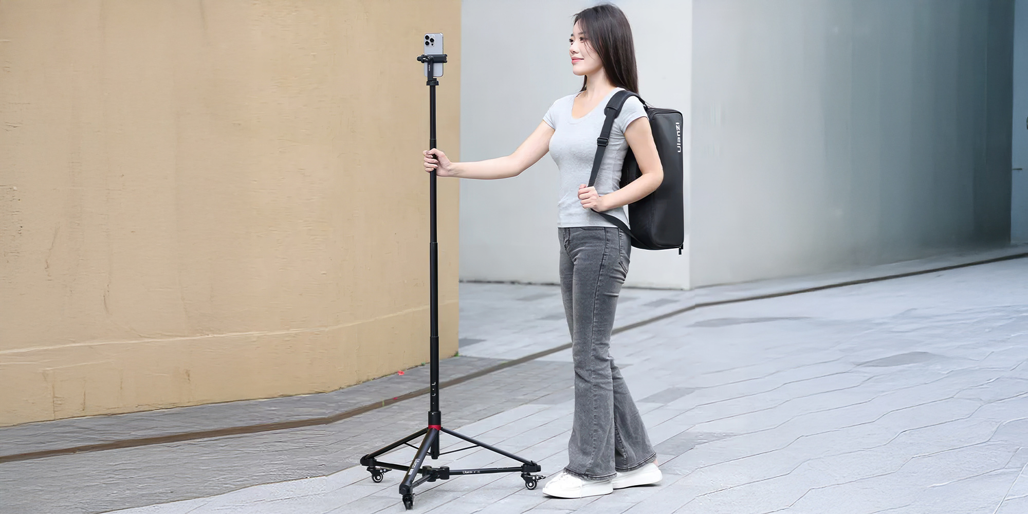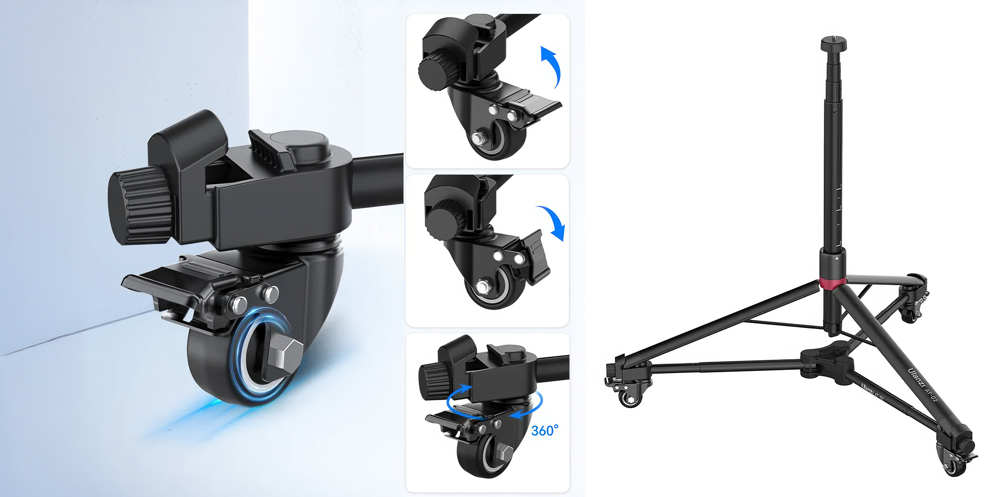 Sometimes, the pace on set can be dizzying and there is never enough space in your bag or boot. That is why the Ulanzi AT-02 tripod roller has a foldable design that is approx. 33 cm long in the transport position. You can easily carry this unique trolley in one hand. The whole thing weighs just over 800 g, so it won’t weigh down your equipment. Thanks to its compact design, you can easily take the wheels to outdoor sessions, industry events or business trips.