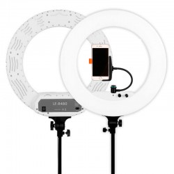 The Caruba Round Vlogger LED set has been developed for models, make-up artists and vloggers. Place the included make-up mirror and phone holder in the ring lamp and you can get started. This way you have the ideal setup for making the perfect selfie or beauty vlog. The ring lamp ensures a clear and natural lighting. To attach the accessories, the LF-R480 has two 1/4 "female threaded connections and a coldshoe, with additional coldshoe connections on top and on the sides, offering many possibilities for creative set-ups.With the spigot with tilting bracket, the LED lamp can be placed on almost every lamp stand.