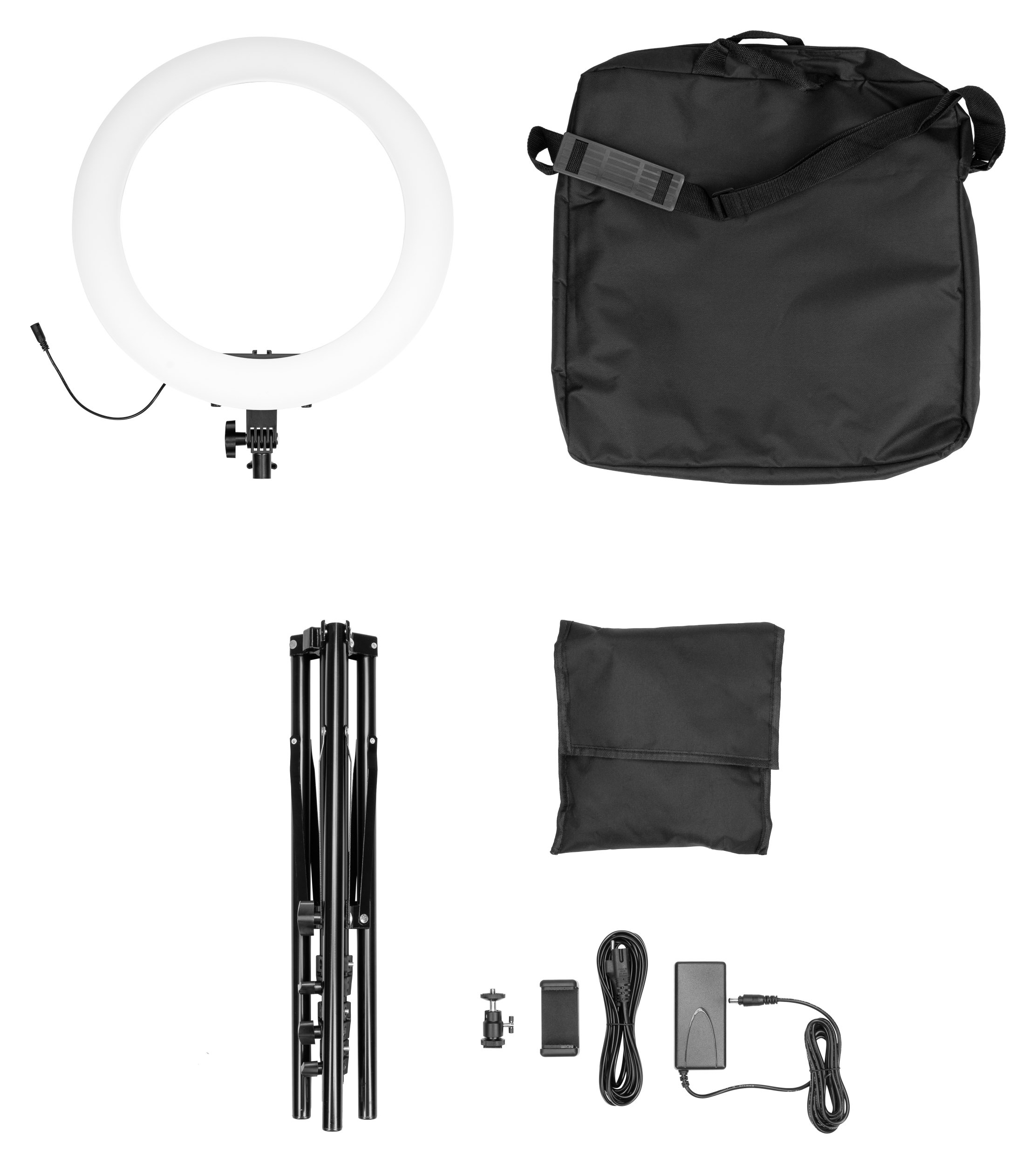 The set with the lamp includes a power supply, a tripod, a ball head and a smartphone holder, i.e. all the elements necessary to work. Thanks to this, the device is ready to use right after unpacking.