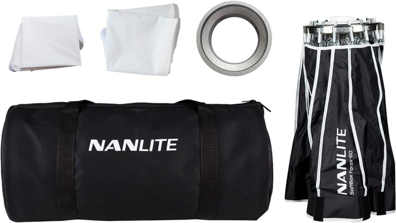 Ideal for portraits and interviews, the 60cm Forza 60 Softbox from Nanlite is a 16-sided light-modifier creating focused and soft light with punchy and crisp edges. This unique shape lends dimension and detail to your subject as well as natural-looking catchlights in their eyes, while the parabolic design of the modifier renders significant falloff at the edge of the subject for an enhanced degree of directional control, decreased spill light, and easy feathering. For greater dramatic control a fabric grid is included.