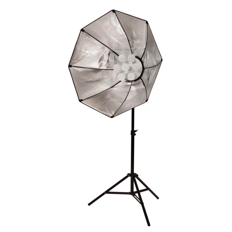 This Caruba All-in-1 LED Octabox Light Set is useful for lighting in the studio. An octabox with a diameter of 90 centimeters is included, including a white diffuse screen. The air-suspended lamp rod has a maximum height of 2.2 meters. Seven 25 Watt E27 LED lamps are also included. These have a color temperature of 5800 degrees and are comparable to a standard 200 Watt lamp.