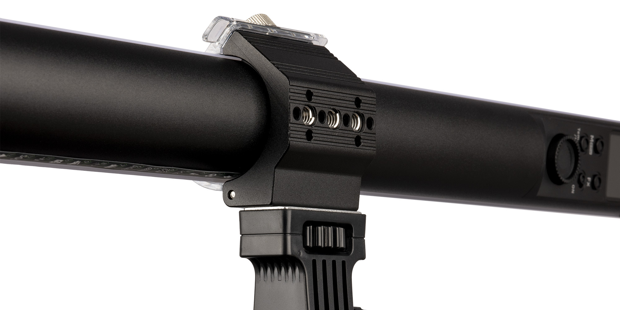 The ergonomic design of the control panel based on a clear LCD screen, buttons and a special knob allows you to change the light settings quickly and conveniently. Included with the lamp you will find a special mounting bracket compatible with 1/4″ thread. The transparent clamp will allow convenient installation, without the risk that any part of the light tube will be obscured. The bracket is equipped with a joint that allows you to tilt the lamp and precisely adjust its positioning to suit your current needs.