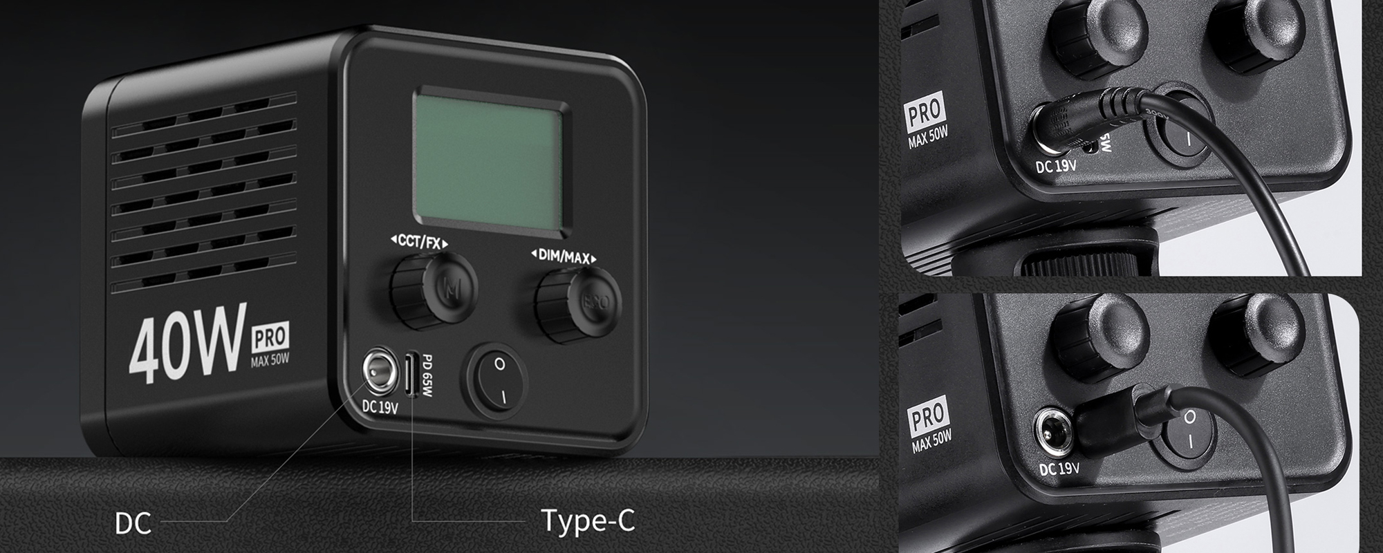 The lamp offers 2 convenient power options so that you never have to worry about losing power at the least opportune moment. You’ll find two charging ports on the housing: DC 19 V / 3.4 A and USB-C (PD 65 W). The ports allow you to charge the lamp quickly and reliably, both with a standard power adapter and via a power bank or compatible chargers. This makes the Ulanzi L23 Pro LED lamp – WB (2500 K – 6500 K) the perfect companion for both studio and travel.