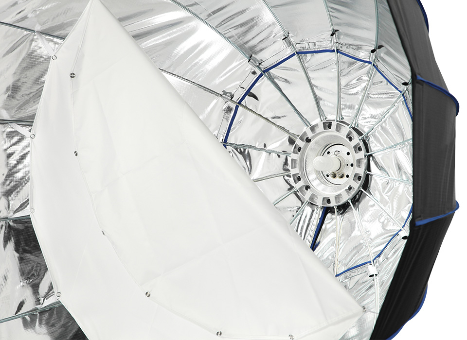 Each Zeppelin softbox comes standard with both an inner and an outer diffusion panel. Both the 1-stop outer diffusion panel and the 1-stop inner diffusion panel can be used by themselves or in tandem. The outer panel is constructed with velcro around the edges for quick attachment. The inner diffusion panel utilizes elastic snaps, ensuring secure placement within the Zeppelin.