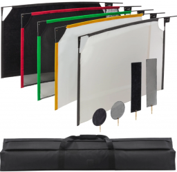 The Caruba Cine Scrim & Fast Flag set consists of a set convenient scrims and fast flags for flagging a light source. With this, you will have more control over light. Put one of the five flags down in the Gobo-Head on a light tripod or C-stand and place this in the desired position for the light. The smaller Dots & Fingers set is used to control smaller light sources that are closer to the lens of the light. These can be used for, for example, packshot or food photography.