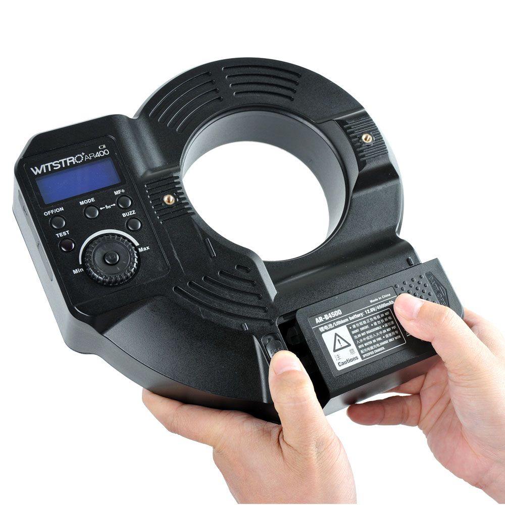 The Witstro AR400 has a flash power of 400Ws and is in 22 steps in brightness adjustable. The ring provides support for flash S1 / S2 slave triggering, RPT stroboscopic flash, high-speed synchronization and a lot more. The AR400 is powered by a professional lithium battery with a capacity of 4500mAh, accounting for approximately 450 times flashes at full power. The recycle time of 0.05-2.8 seconds is fast. To charge the battery is supplied with a battery charger.
