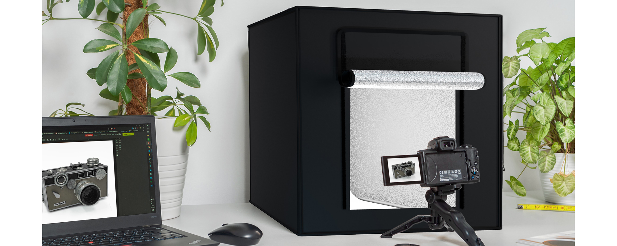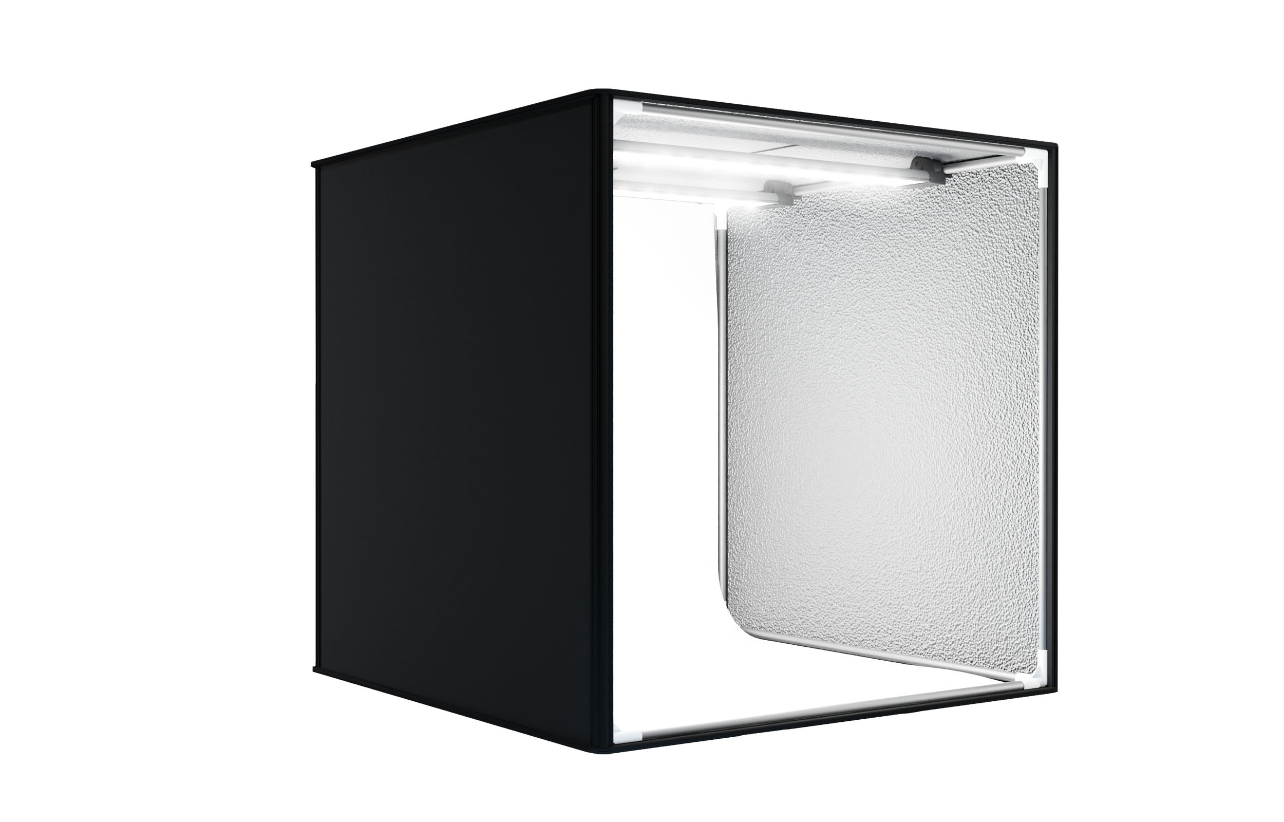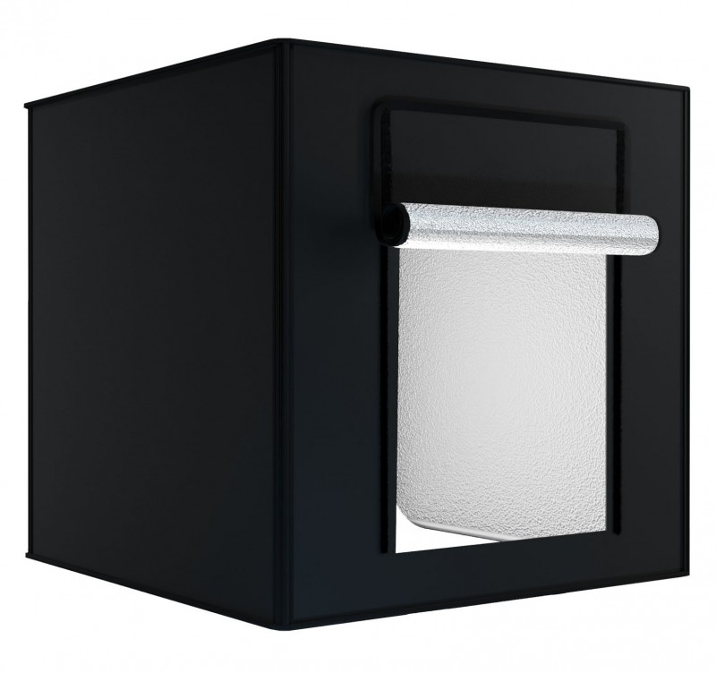The tent is equipped with two LED panels, whose position can be freely adjusted to achieve different lighting configurations. Its interior is covered with a special material that evenly distributes the light generated by the lamps. An additional diffuser allows to obtain the effect of diffuse, soft lighting, reducing glare, reflections and shadows on the photographed product.